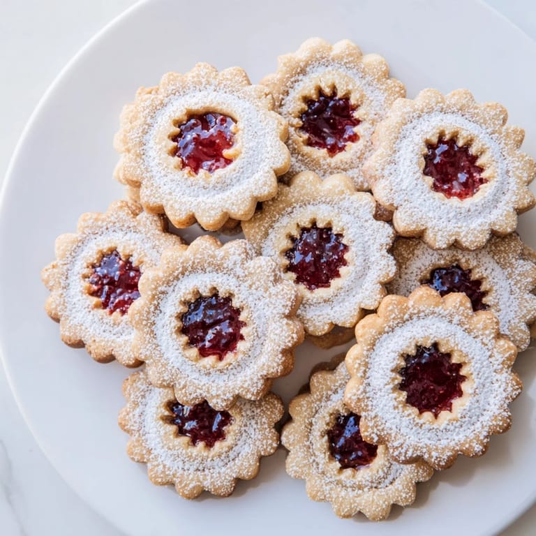 Save There's something about the smell of butter and almonds toasting in the oven that instantly transports me back to my grandmother's kitchen during the holiday season. She'd stand at her counter with two round cutters—one for the cookie bottoms, one for the tops—and I'd watch as she carefully carved little windows into the dough. The first time I tried making these Linzer cookies myself, I was determined to recreate that magic, and the moment I bit into one still warm from the oven, jam glistening through the cutout, I understood why she'd made them every December without fail.